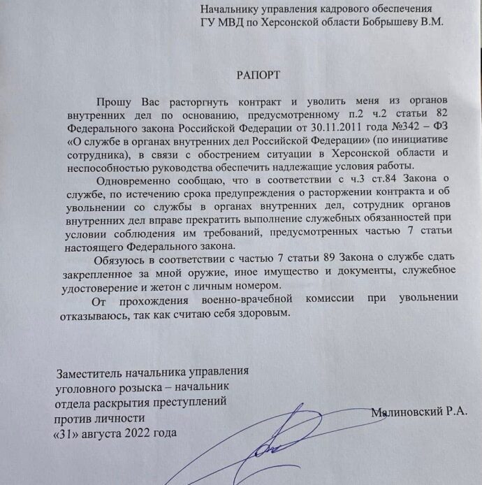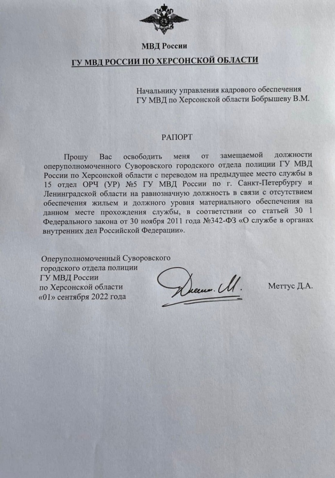 The second Russian-appointed policeman has asked to return to his previous station in St. Petersburg. According to the published document, D.A.Mettus , who is the “supervisor of the Suvorov city police department of the Ministry of the Interior of the Russian Federation in Kherson oblast”, wants to return to his former place of work allegedly due to the “lack of housing provision and inadequate compensation” in Kherson.